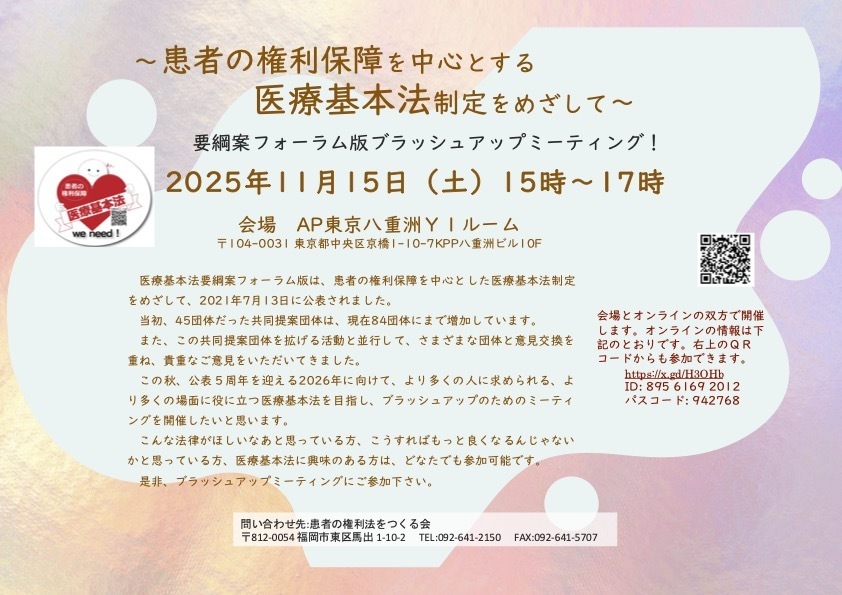 総会に続いて15時から、いつもの医療基本法フォーラムを拡大して、医療基本法について自由に語るブラッシュアップミーティングを企画しています。来年は医療基本法要綱案フォーラム版の発表から5周年を迎えます。政治が混迷しているなか、たいせつにすべきなのは何なのか、医療をより人権に根ざしたものにするために、法律はどうあるべきなのか、それぞれのお立場や経験から自由に語りあいましょう。